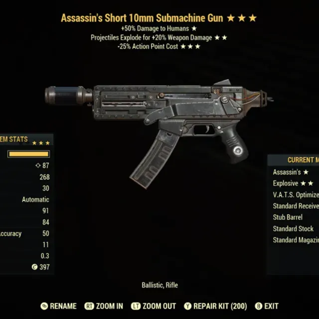 Type: Weapon. Assassin’s, explosive, 35% less vats cost lvc 10mm submachine gun. Max level