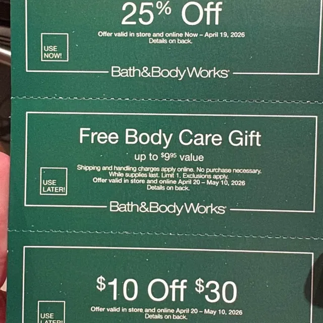 1 travel free body care gift up to $9.95 starts April 20th exp may 10th