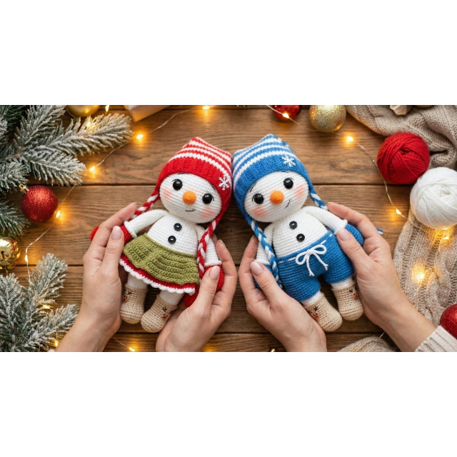 Create your own adorable Christmas Snowman Amigurumi Set with this detailed and beginner-friendly Crochet Pattern PDF! This pattern allows you to make two cute snow dolls — a boy snowman with blue shorts and a girl snowgirl with a charming green skirt. Perfect for festive décor, handmade gifts, and winter crafting fun!