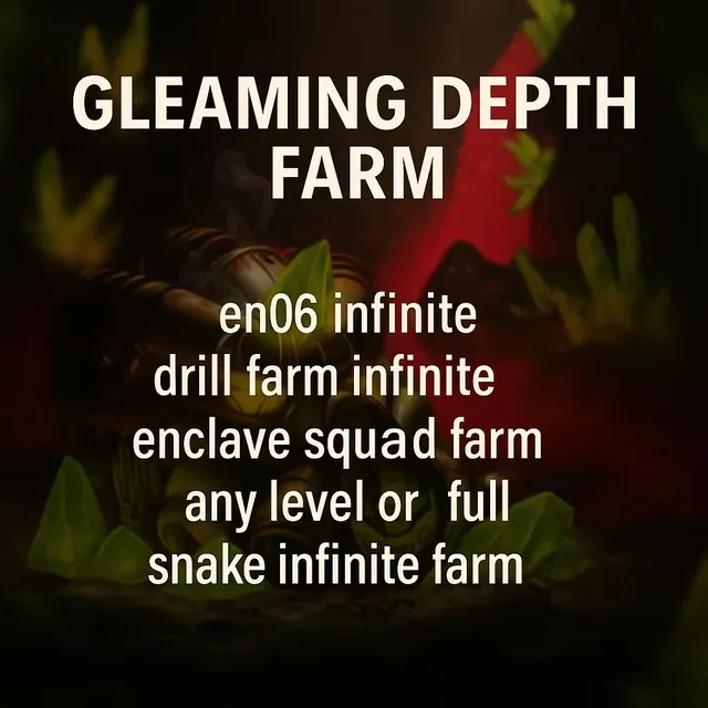 Gleaming Depth Raid PC best carry service,En06 afk,drill fueling afk, Enclave Squad Epsilon,research lab,snake boss ultraite terror farm 1h,you'll get vulacn helmet,jetpack,torso,arms and mods,xp etc,insane power leveling