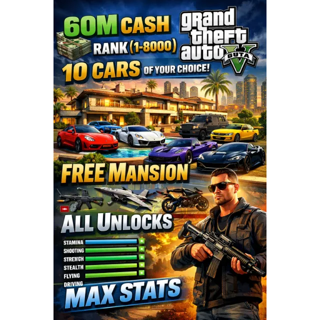 GTA V PC ENHANCED | 60M CASH | RANK (1-8000) | 10 CARS OF YOUR CHOICE | FREE MANSION | ALL UNLOCKS | MAX STATS