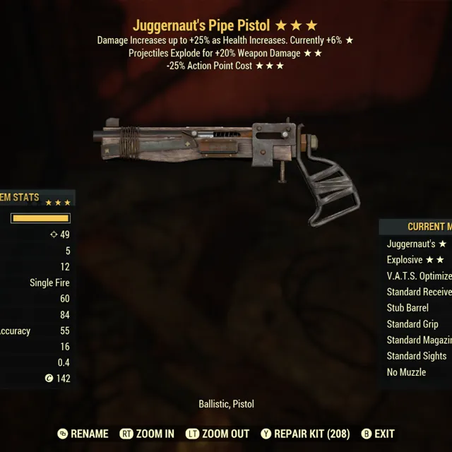 Type: Weapon. Juggernauts, explosive, 25% less vats cost lvc pipe pistol. Max level