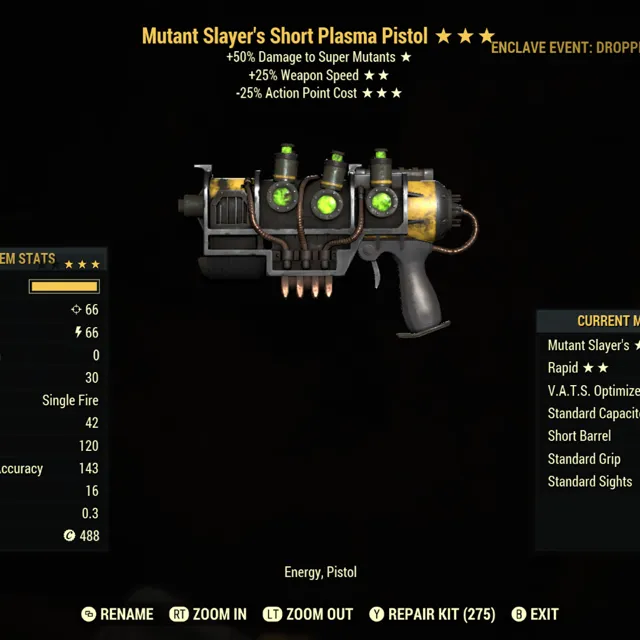Type: Weapon. Mutant slayers, weapon speed, 25% less vats cost lvc plasma gun. Max level