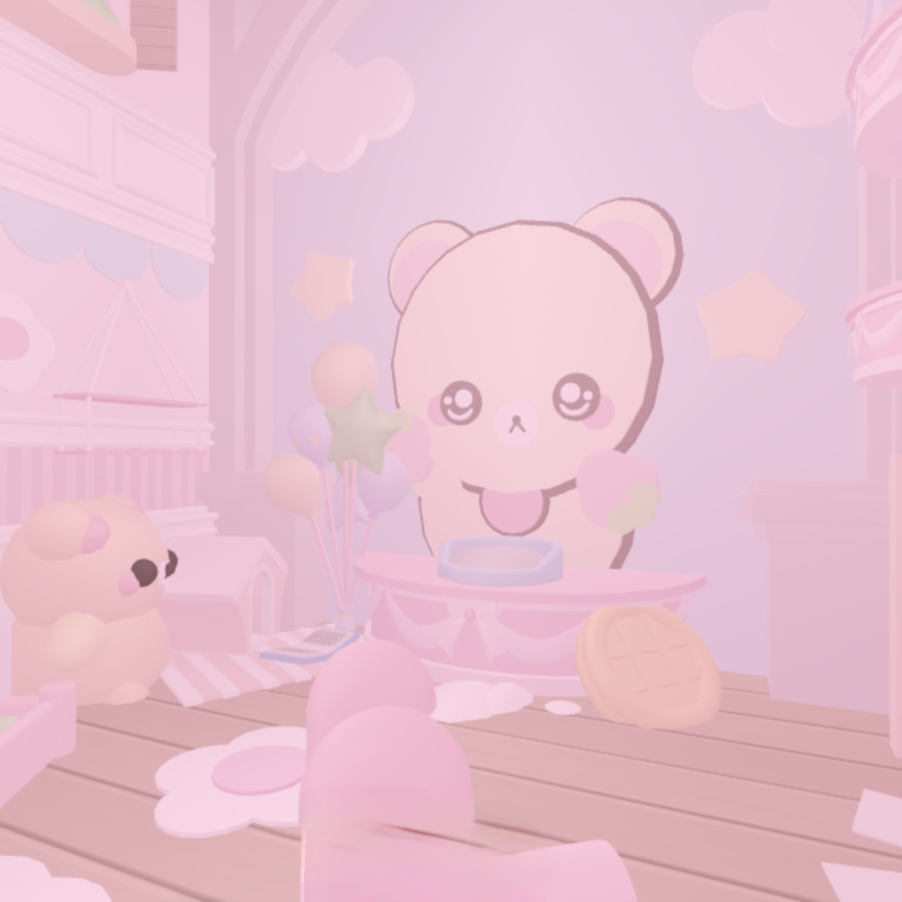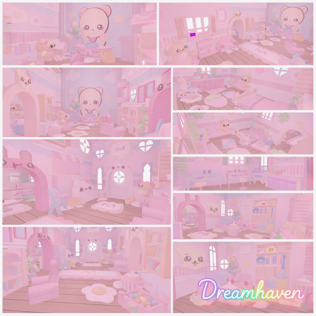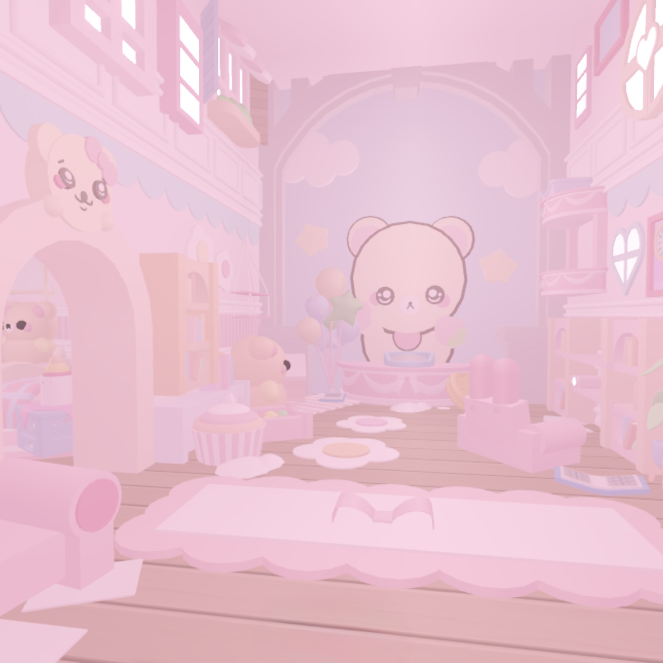 This fully decorated adopt me pastel home has a soft, cozy aesthetic with gentle pink tones and adorable bear-themed décor throughout. Every room feels warm and thoughtfully put together, with cloud rugs, heart and paw details, balloons, and cute character accents that give the space a calm, playful vibe.