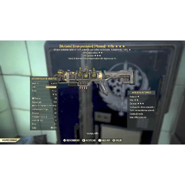 Plasma rifle with 50% damage to mutants, vital for a 50% critical hit rate, +3 Charisma