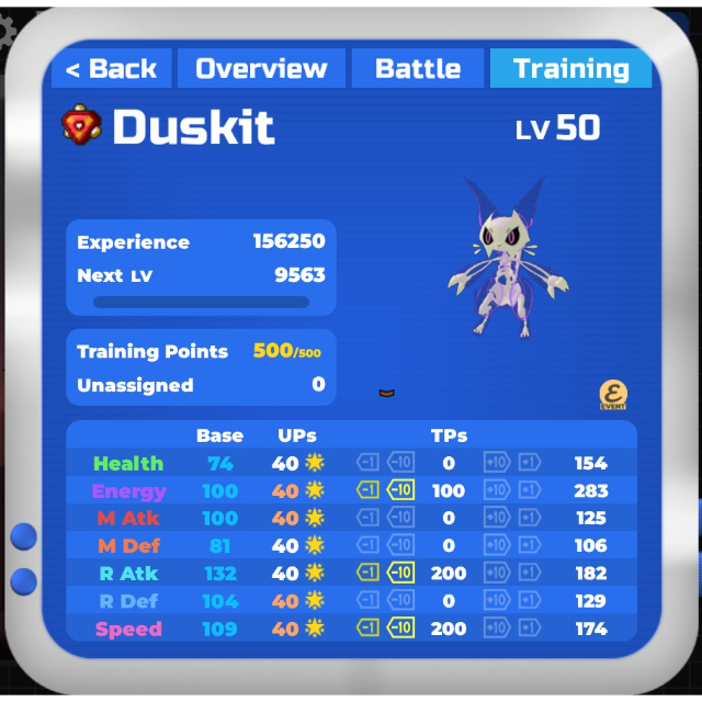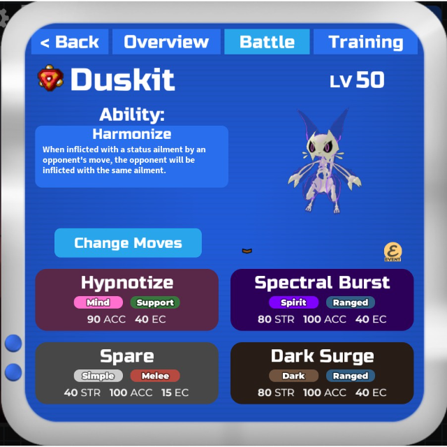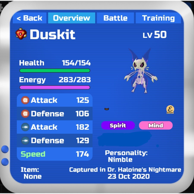 This Loomian was exclusively available during the 2020 Halloween Event and is no longer obtainable. It features one of the best possible personalities for a Duskit, making it perfect for ensuring all your wild Loomian captures are 100% Nimble—or for competitive battling.