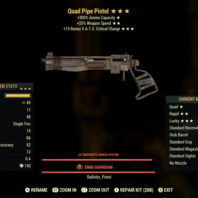 Type: Weapon. Quad, weapon speed, faster crit automatic pipe weapon. Max level. Fast fire rate. Critical. Crit