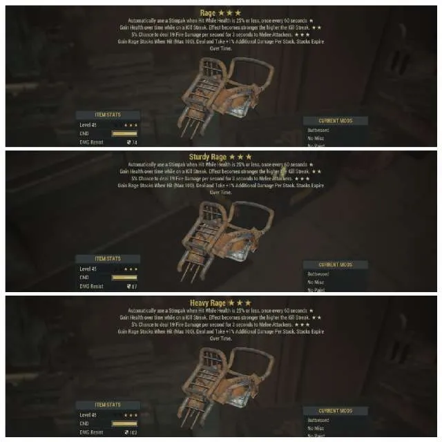 This is a complete set of all 3 variants of the new Rage armor from the event A Colossal Problem (Light Rage, Sturdy Rage, and Heavy Rage). The following effects are the same for every piece, the difference is in the weight of the chest pieces and their damage resistance numbers.