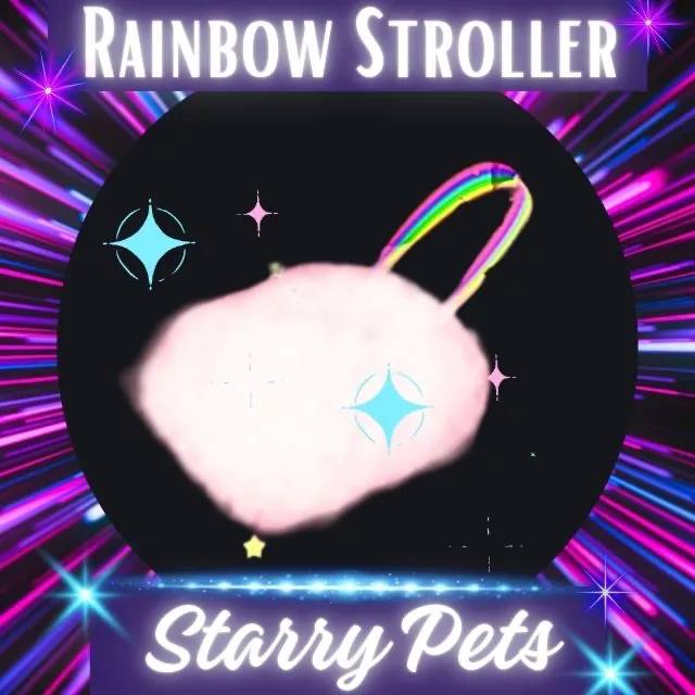 The Rainbow Stroller is a limited ultra-rare stroller in Adopt Me! It was removed from the game on June 24, 2021. Features a white cloud that floats above the ground. It has a rainbow handle with sparkles floating around. This stroller leaves behind a sparkly rainbow trail wherever and whenever a player walks.