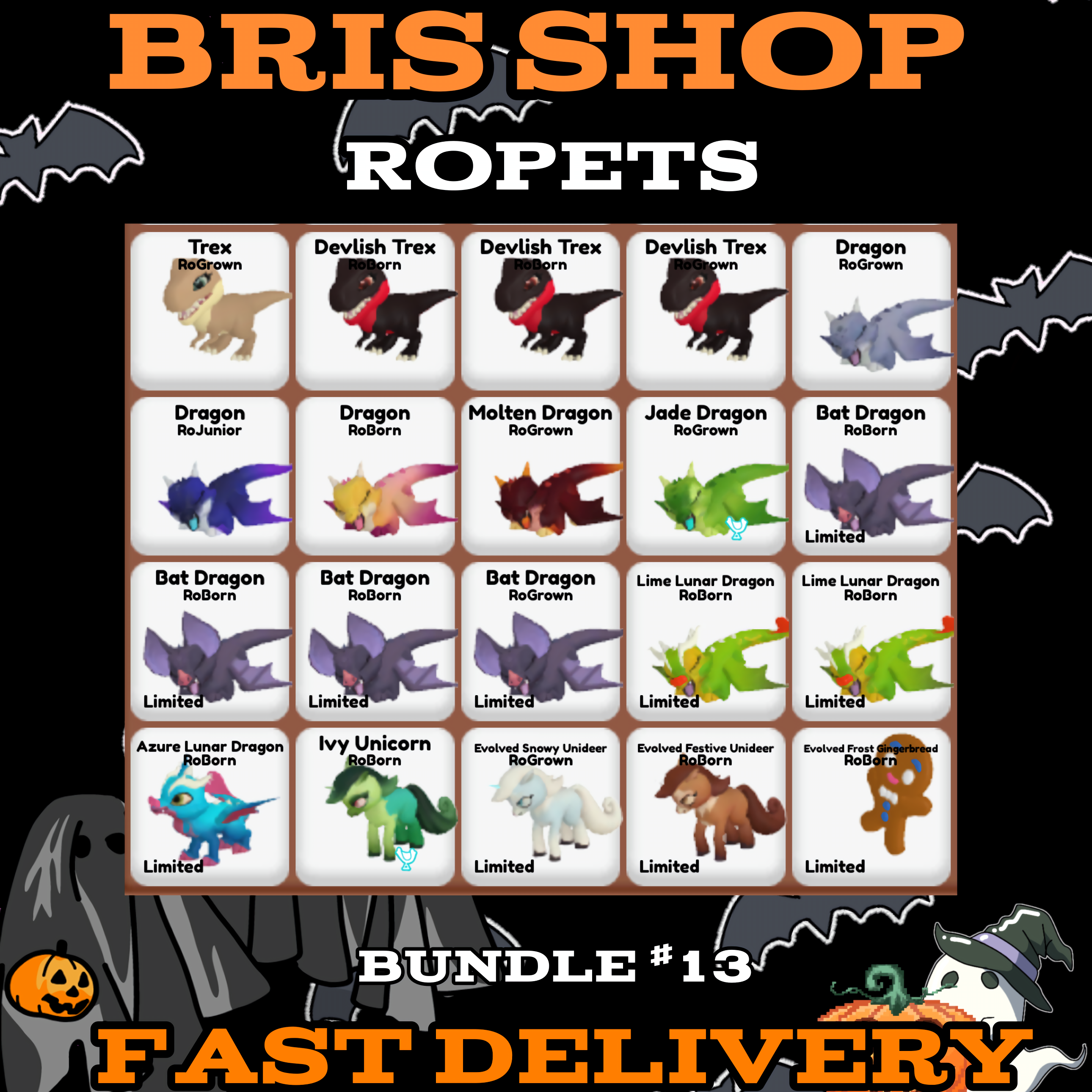 Trex, 3x Devilish Trex, Dragon, Molten Dragon, Jade Dragon, Koi Dragon, Galaxy Dragon, 4x Bat Dragon, 2x Lime Lunar Dragon, Azure Lunar Dragon, Ivy Unicorn, Evolved Snowy Unideer, Evolved Festive Unideer, Evolved Frost Gingerbread.
