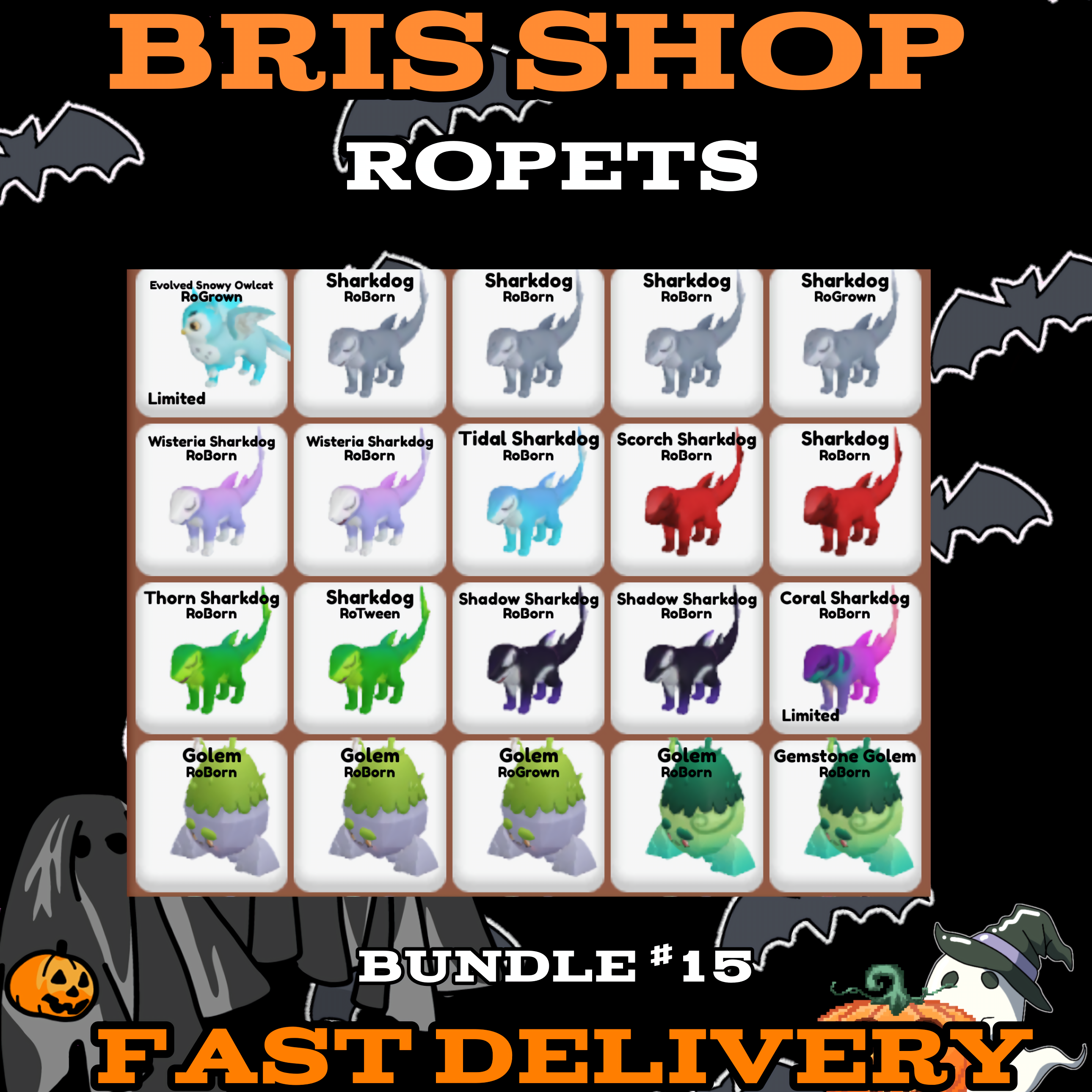 Evolved Snowy Owlcat, 4x Sharkdog, 2x Wisteria Sharkdog, Tidal Sharkdog, Scorch Sharkdog, 2x Thorn Sharkdog, 2x Shadow Sharkdog, Coral Sharkdog, 3x Golem, 2x Gemstone Golem