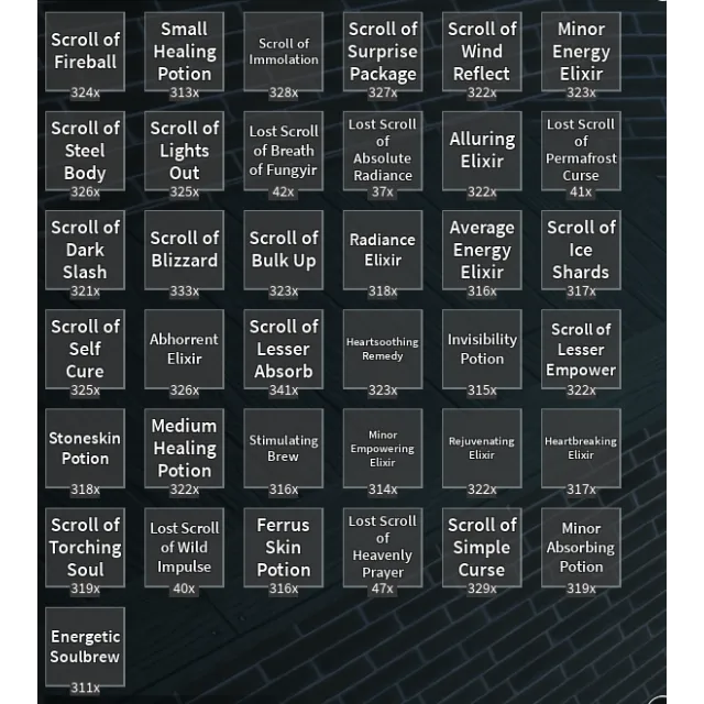 Selling Scrolls and Lost Scrolls | Arcane Lineage | Selling Scrolls and Lost Scroll > Scroll of Fireball, Small Healing Potion, Scroll of Immolation, Scroll of Surprise Package, Scroll of Wind Reflect, Minor Energy Elixir, Scroll of Steel Body, Scroll of Lights Out, Lost Scroll of Breath of Fungyr, Lost Scroll of Absolute Radiance, Alluring Elixir, Lost Scroll of Permafrost Curse, Scroll of Dark Slash, Scroll of Blizzard, Scroll of Bulk Up, Radiance Elixir, Average Energy Elixir, Scroll of Ice Shards, Scroll of Self Cure, Abhorrent Elixir, Scroll of Lesser Absorb, Heartsothing Remedy, Invisibility Potion, Scroll of Lesser Empower, Stoneskin Potion, Medium Healing Potion, Stimulating Brew, Minor Empowering Elixir, Rejuvenating Elixir, Heartbreaking Elixir, Scroll of Torching Soul, Lost Scroll of Wild Impulse, Ferrus Skin Potion, Lost Scroll of Heavenly Prayer, Scroll of Simple Curse, Minor Absorbing Potion, Energetic Soulbrew