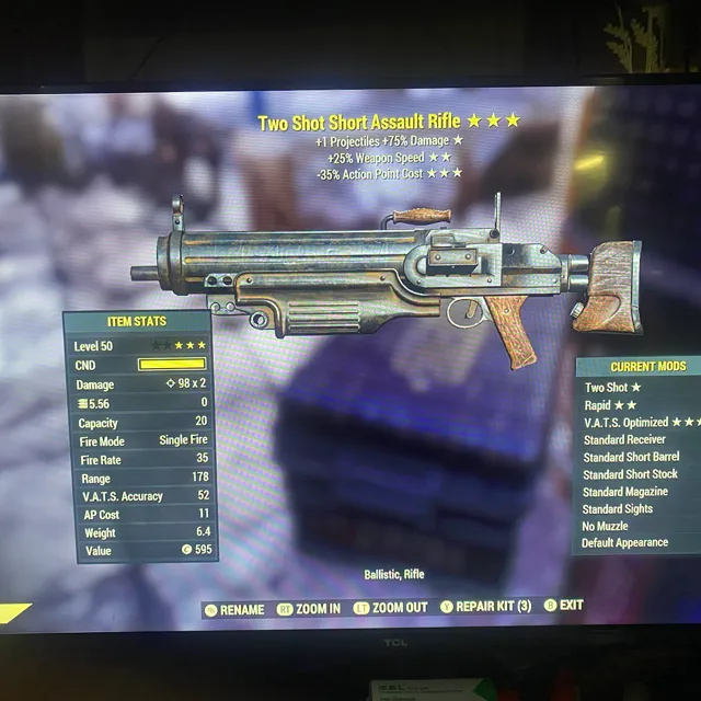 Type: Weapon. Two shot, weapon speed, 35% less vats cost lvc assault rifle. Max level