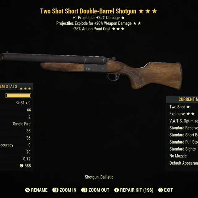Type: Weapon. Two shot, explosive, 25% less vats cost lvc double barrel shotgun. Max level