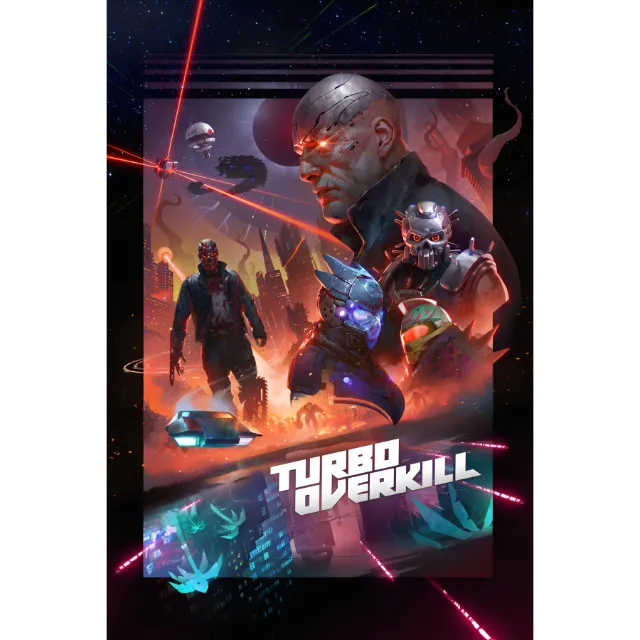 Turbo Overkill takes over-the-top action to new heights. Activate Hero Time™, a new form of slow motion with a twist. Gain incredible speed by running up walls and sprinting. Glide around on your chainsaw leg, eviscerate enemies and open up bosses for critical damage, and zip over the hoods of flying cars. Fire with the Twin Magnums, which lock onto and instagib multiple enemies, the Boomer shotgun and its attached grenade launcher, or the Telefragger sniper rifle, which teleports Johnny inside an enemy before exploding from within. The FPS genre is about to get wild and fun again.
