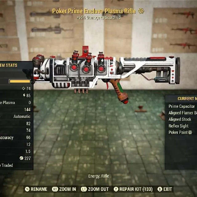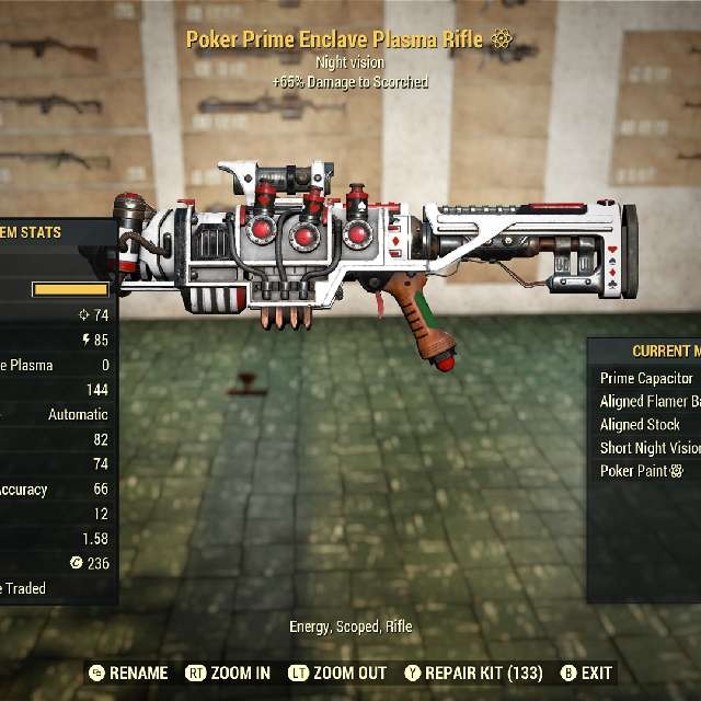 Type: Weapon. Bundle includes One absolutely beautifully modded unrolled enclave plasma rifle, with choice of scope. Mods are Prime capacitor, aligned flamer barrel, aligned stock and reflex sight (or short night vision scope). Also included is one furious, mod one vital mod and one durability mod. This is a beautiful close range weapon and raid robot killer. I highly recommend you use the mods supplied. Energy guns break easily. So the durability is a must