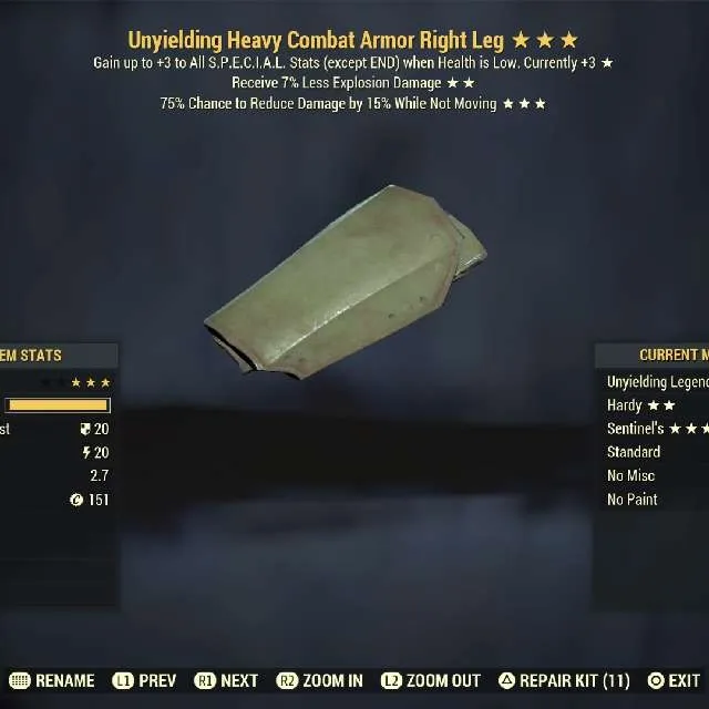Unyielding receive 7% less explosion damage sentinel Heavy Combat Armor Right Leg Max Level