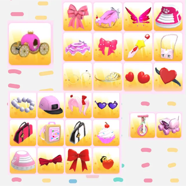 Heart bow, ice cream heels, pink butterfly wings, pink hightops, tutu, bow shoes, magic girl sword, glamicorn purse pet, gold circle glasses, gold tiara, purple heart glasses, pear necklace, red purse, white purse, pink twintails, pink sneakers, pretty red bow, ice cream hat, princess carriage, pink 5 panel cap, & lots more!