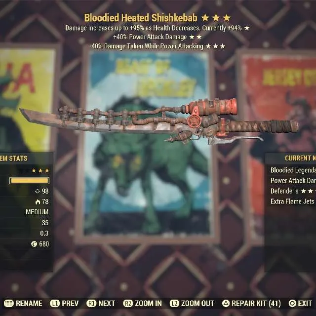 Bloodied +40% power attack damage -40% damage taken while power attacking Shishkebab Max Level
