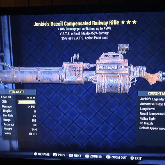 Junkies 50 critical hit damage 25 less vats cost Railway Rifle
