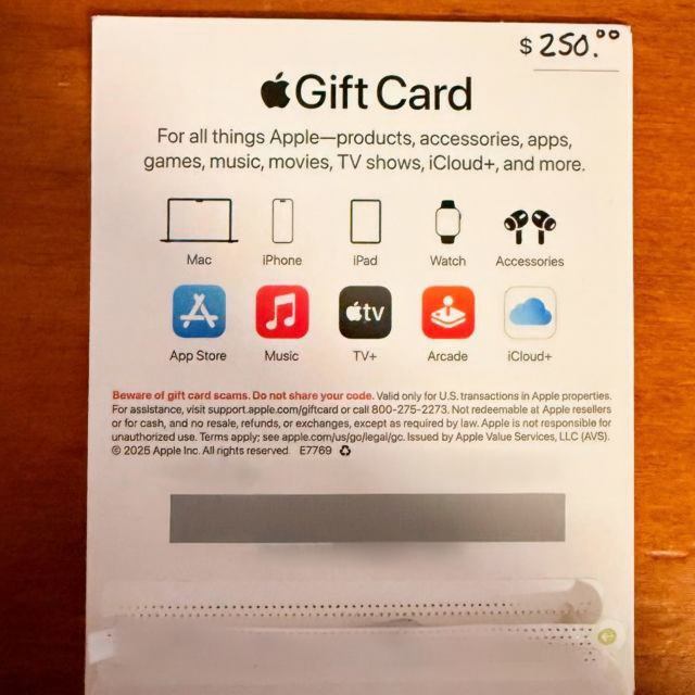 $250 USD Physical Apple Gift Card (US) - For Everything Apple - Instant Code Delivery
