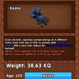 Every 18:40m, launches cursed energy at 9 different fruits. Each fruit has 27.73% to mutate with Corrupt Chakra with a very rare chance for Corrupt Foxfire Chakra instead!