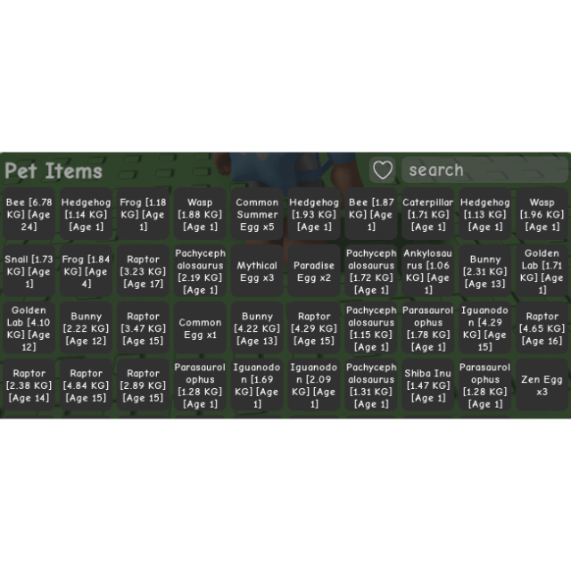 PETS: BUG EGG X1, BROWN MOUSE, MANEKI NEKO, GREY MOUSE, SILVER MONKEY, WASP, RED GIANT ANT, PACHYCEPALOSAURUS, RARE SUMMER EGG X3 AND OTHER ADDITIONAL IN THE PHOTOS.