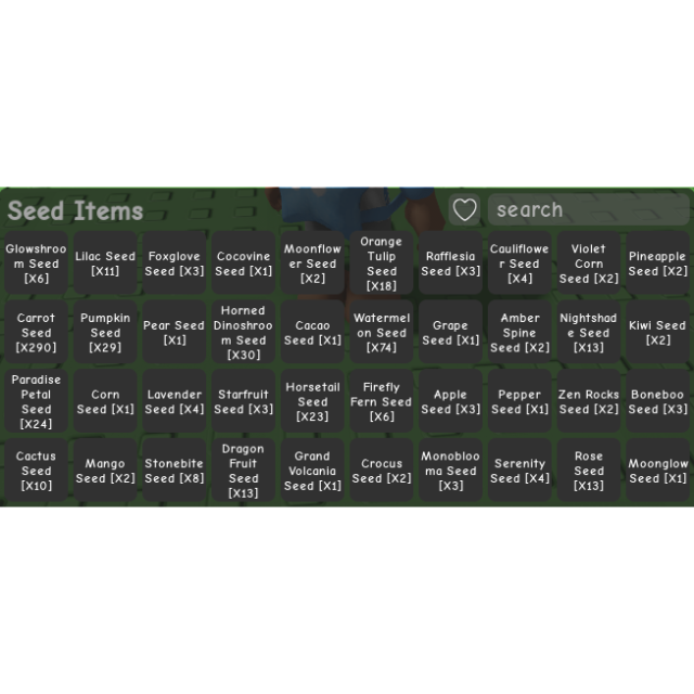 SEEDS: BEANSTALK SEED X1, ZEEN SEED PACK X1, CELESTIBERY SEED X9, MUSHROOM SEED X79, MINT SEED X2, BANANA SEED X3 AND OTHER ADDITIONAL IN THE PHOTOS