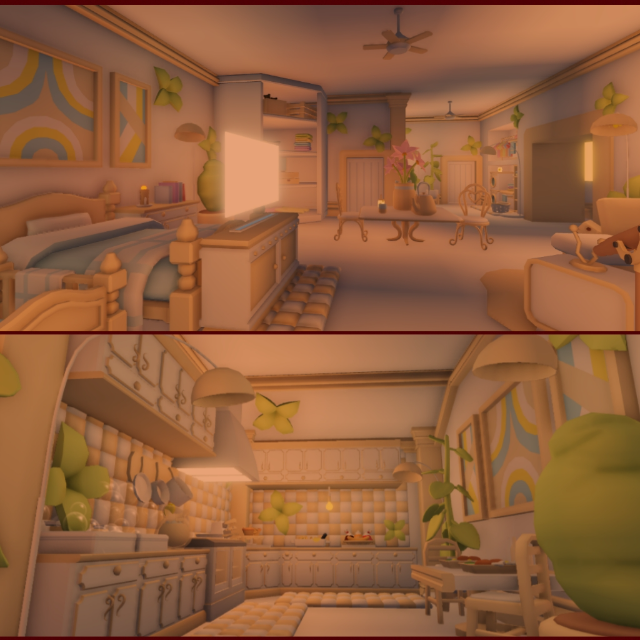 ☕ Detailed Kitchen – Pastel cabinetry, patterned tiles, and perfect décor touches for that coquette aesthetic.