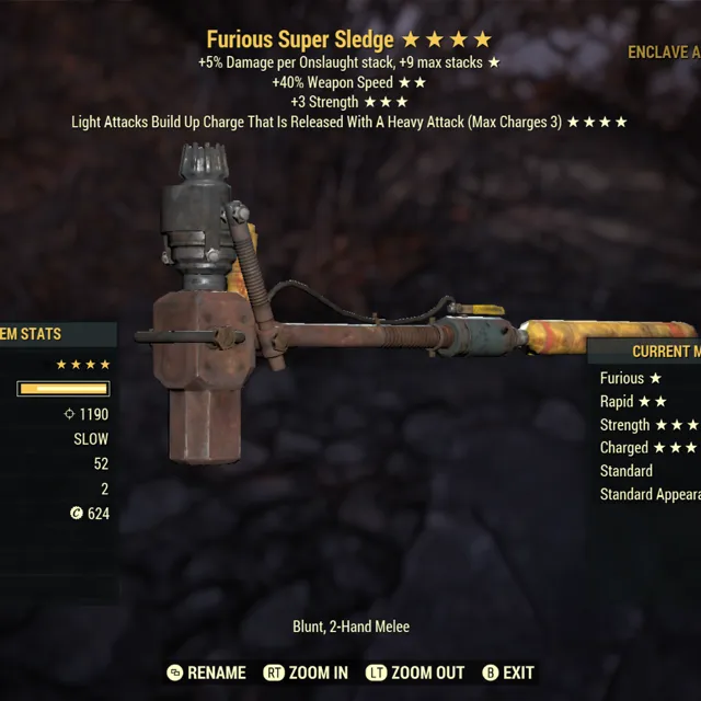 Type: Weapon. Furious, rapid, 3 strength, charged super sledge. Max level four star weapon.