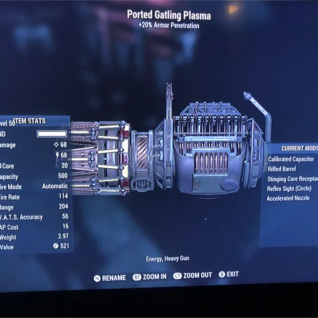 Type: Weapon Gatling Plasma modded with Calibrated capacitor, Stinging Core receptacle, Reflex sight and Accelerated Nozzle