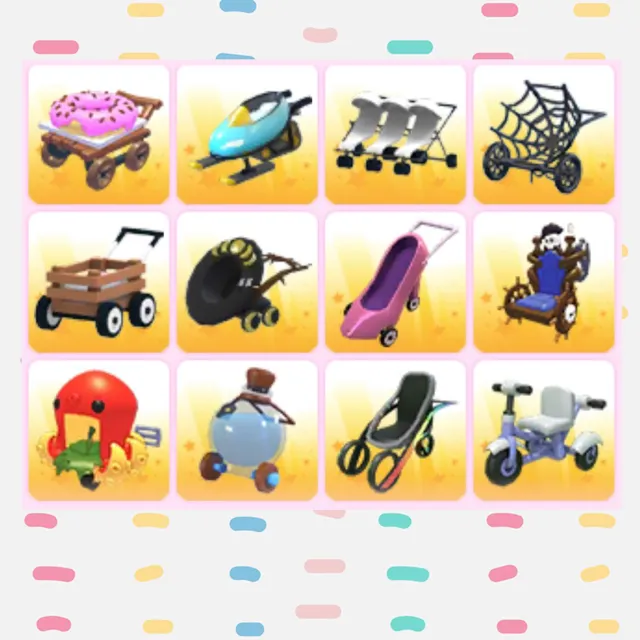 Donut stroller, snowmobile stroller, triple stroller, web stroller, Halloween black hat stroller, pirate captains stroller, takoyaki stroller, potion stroller, rgb stroller, trike stroller & more!