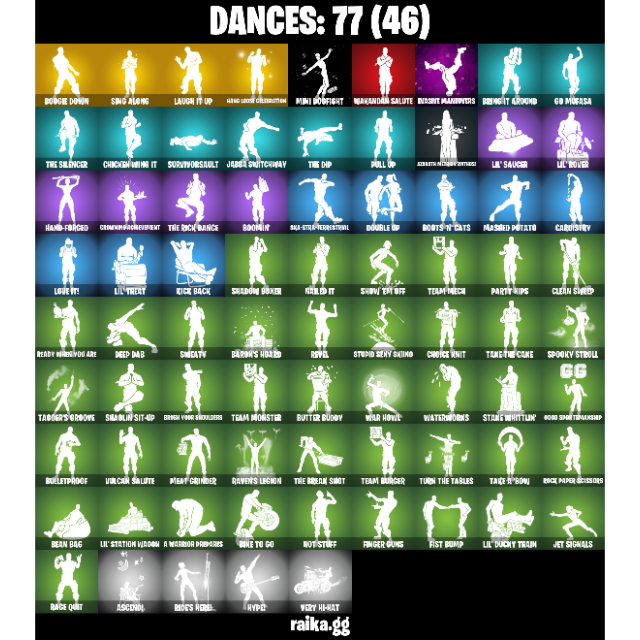 • Outfits: 60 | Back Blings: 120 | Pickaxes: 94 | Dances/Emotes: 77