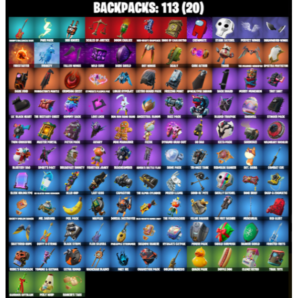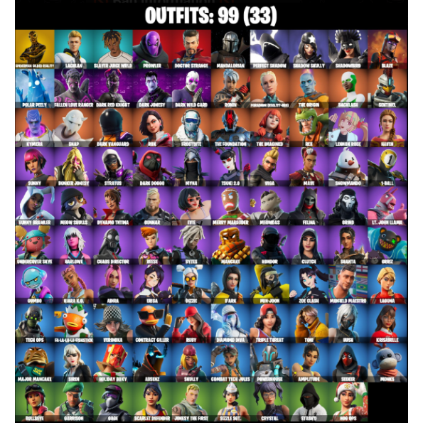 Spider-Man | Lachlan | Slayer Juice WRLD | Prowler | Doctor Strange | Mandalorian | Perfect Shadow | Shadow Skully | Shadowbird | Blaze | Polar Peely | Fallen Love Ranger | Dark Red Knight | Dark Jonesy | Dark Wild Card | Ronin | Paradigm (Reality-659) | The Origin | Backlash | Sentinel | Kymera | Snap | Dark Vanguard | Rox | Frostbite | The Foundation | The Imagined | Rex | Lennox Rose | Haven | Sunny | Bunker Jonesy | Stratus | Dark Doggo | Myna | Tsuki 2.0 | Vega | Mave | Snowmando | 8-Ball | Bunny Brawler | Meow Skulls | Dynamo | TNTina | Gunnar | Evie | Merry Marauder | Meowdas | Felina | Grind | Lt. John Llama | Undercover Skye | Harlowe | Chaos Director | Reese | Bytes | Mancake | Kondor | Clutch | Shanta | Grriz | Gumbo | Kiara K.O. | Adira | Erisa | Dizzie | D'Ark | Min-joon | Zoe Clash | Midfield Maestro | Laguna | Tech Ops | Fa-La-La-La-Fishstick | Veronika | Contract Giller | Ruby | Diamond Diva | Triple Threat | Toni | Hush | Krisabelle | Major Mancake | Siren | Holiday Boxy | Absenz | Skully | Combat Tech Jules | Powerhouse | Amplitude | Seeker | Monks | Bullseye | Garrison | Gage | Scarlet Defender | Jonesy The First | Sizzle Sgt. | Crystal | Stash’d | Nog Ops