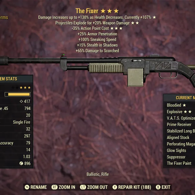 Type: Weapon. Bloodied, explosive, vats optimized fixer. Max level