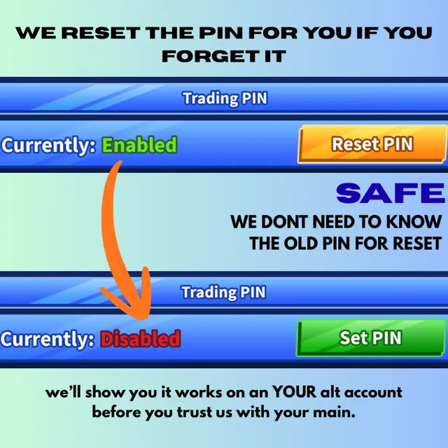 I’ll reset the pin on any blade ball account of yours. The process as soon as I’m online takes about 2 minutes, It’s very simple. Since this can’t be done remotely, it requires account login details, however, we allow you to give us an alt account so you can see it works for yourself, before trusting us. Reminder you are protected by gameflip buyer protection, roblox, and myself, as I free of charge on the same order will remove the pin off of an alt account to gain your trust. For details you can message me :)