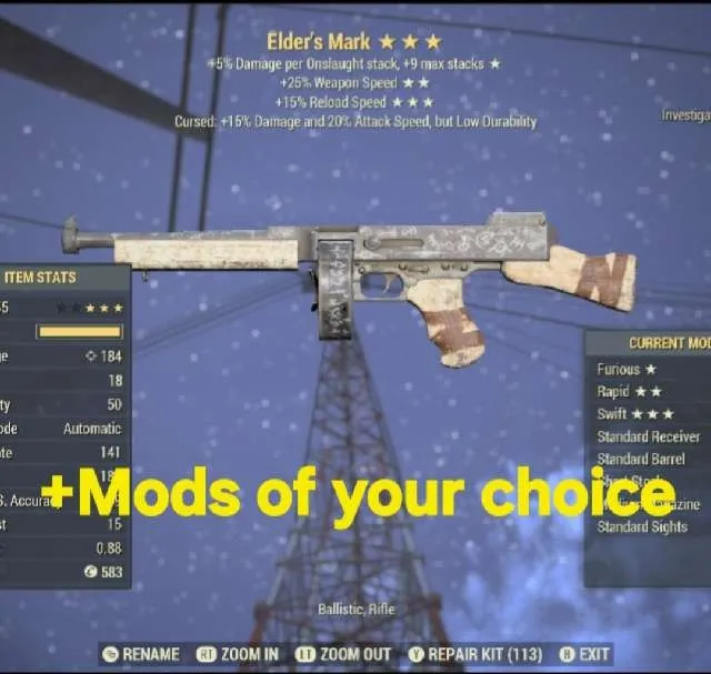 Any 1-4* mods you request for you to make whatever Elder's Mark weapon you want. I can also change any other mods you want to it to customize it to your needs.
