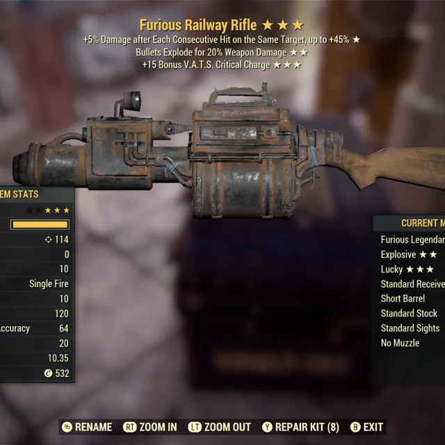 Type: Weapon. Furious, explosive, 15 faster Crit fill railway rifle. Max level