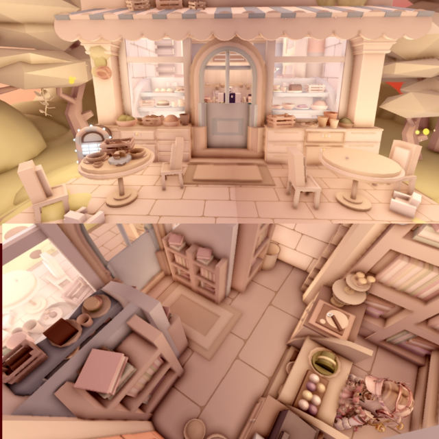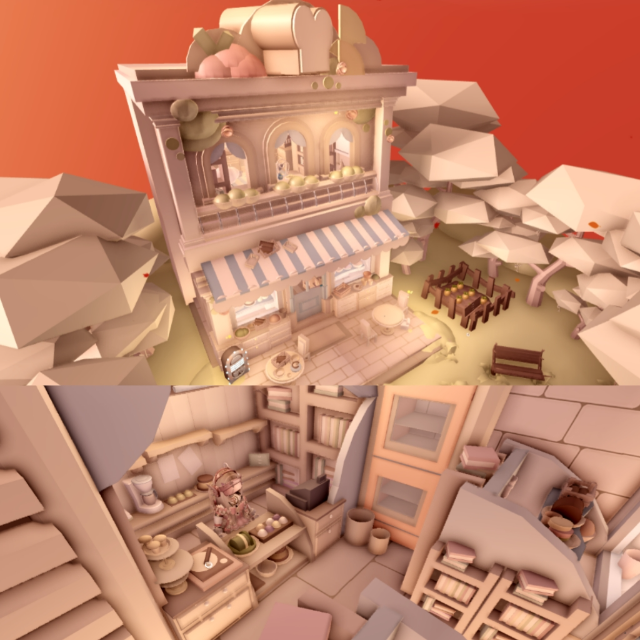 A soft, sunset-toned café nestled in a calm countryside setting. Warm peach hues, rustic textures, and gentle lighting create a welcoming atmosphere inside and out. From the charming storefront with striped awnings to the snug interior filled with baked goods and cozy seating, the entire space feels like a peaceful, homemade retreat.