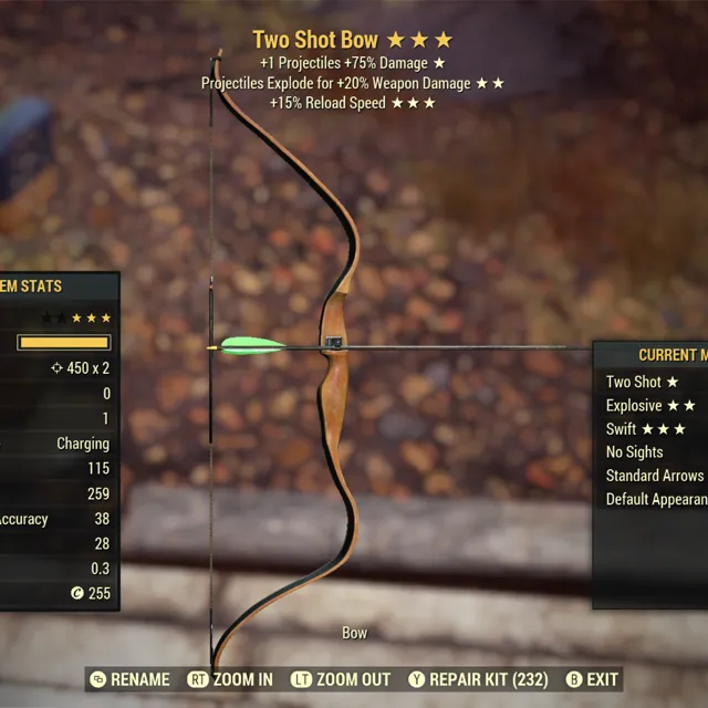 Type: Weapon. Two shot, explosive, fast reload / swift bow. An absolute beast. Max level