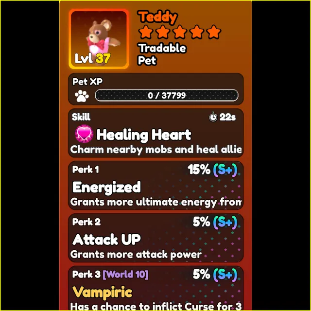 PREFECT PINK TEDDY = Perks are 5 vampiric, 5 Attack, 15 ENERGIZED